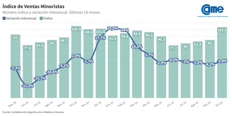 En octubre, las ventas minoristas pymes mostraron una leve mejora mensual, aunque continuaron por debajo del nivel del año anterior. La mayoría de los rubros registró caídas interanuales, con “Perfumería” y “Bazar y decoración” entre los más afectados. Las promociones y el Día de la Madre impulsaron transitoriamente la demanda, sin revertir la tendencia general de consumo prudente. Los comercios encuestados destacaron mayores costos operativos, baja rentabilidad y escaso acceso al financiamiento. Predomina la cautela en las expectativas y la baja disposición a invertir.