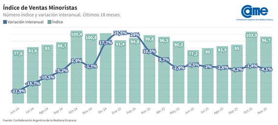 LAS VENTAS MINORISTAS PYME DESCENDIERON 4,1% INTERANUAL EN NOVIEMBRE
