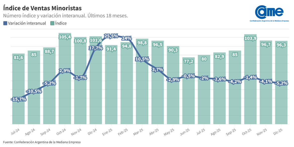 En diciembre, el comercio minorista pyme experimentó un retroceso del 5,2% interanual a precios constantes. En contrapartida, el número varió en la medición desestacionalizada frente a noviembre: el resultado fue de un incremento del 5,2%. Con estos valores, el índice de todo el 2025 cerró con una variación positiva acumulada del 2,5%.